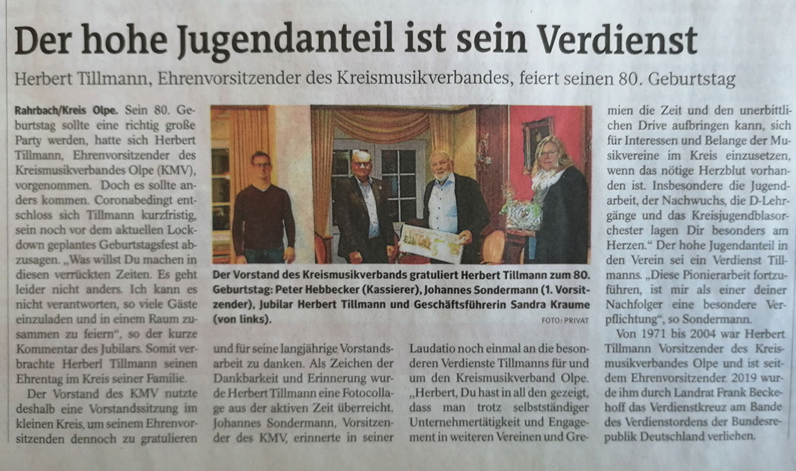 Herbert Tillmann, Ehrenvorsitzender des Kreismusikverbandes, feiert seinen 80. Geburtstag: