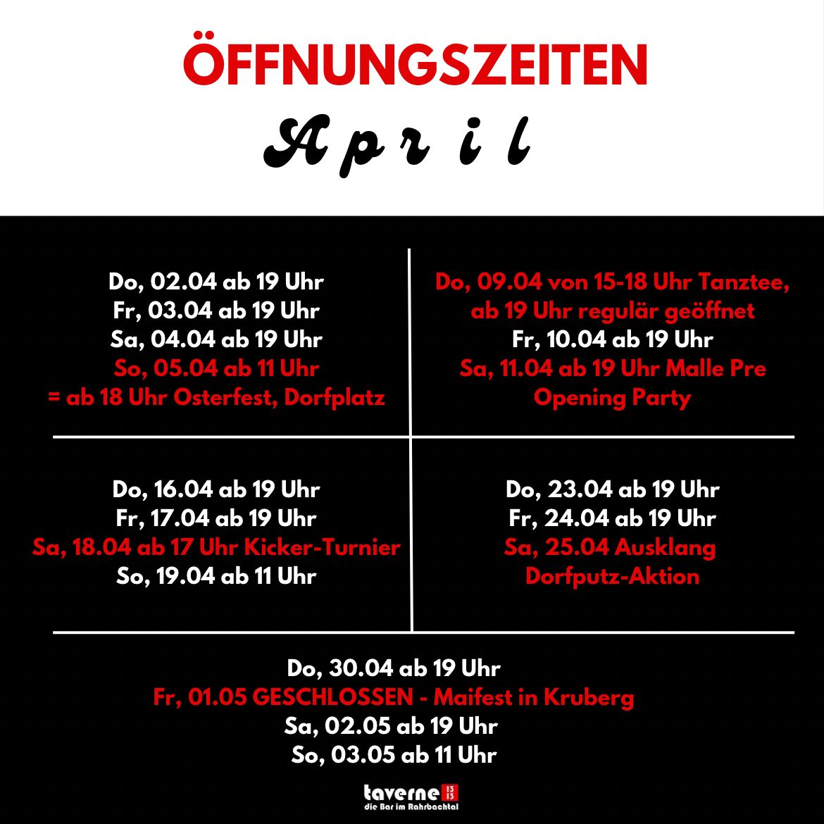 Öffnungszeiten taverne 1313