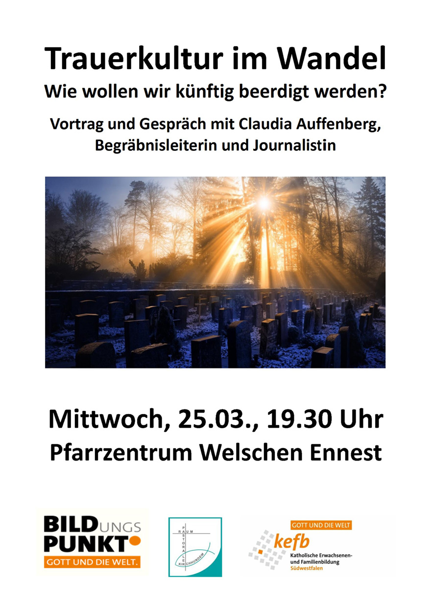 „Wie wollen wir künftig beerdigt werden?“ Diese Frage steht im Mittelpunkt eines Vortrages und Gesprächsabends am Mittwoch, dem 25.03. um 19.30 Uhr im Pfarrzentrum Welchen Ennest.
