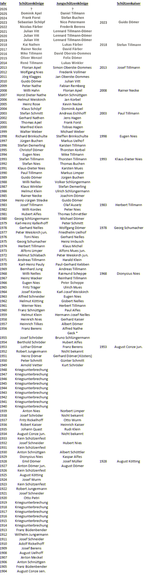 Die nachfolgende Liste zeigt Ihnen sämtliche Schützen- und Jungschützenkönige (bis 1955 “Geck”) sowie die Schützenkaiser in unserer über 120-jährigen Vereinsgeschichte: