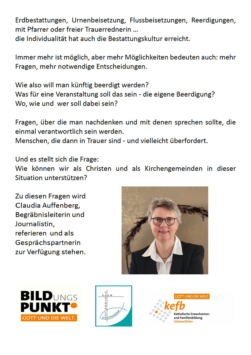 „Wie wollen wir künftig beerdigt werden?“ Diese Frage steht im Mittelpunkt eines Vortrages und Gesprächsabends am Mittwoch, dem 25.03. um 19.30 Uhr im Pfarrzentrum Welchen Ennest.